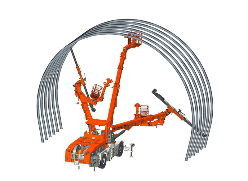 雙鑿巖拱錨臺車融合拱架施工與錨桿施工為一體,適應各種規(guī)格鋼拱架安裝、錨桿施工、輔助裝藥平臺、輔助撬毛和通風管作業(yè)等多功能,滿足在鐵路、公路隧道內安裝單榀/多榀鋼拱架的規(guī)范性及安全性要求,滿足單洞單線、雙線、三線單次開挖(全斷面、臺階法)一次性鋼拱架安裝距離要求。