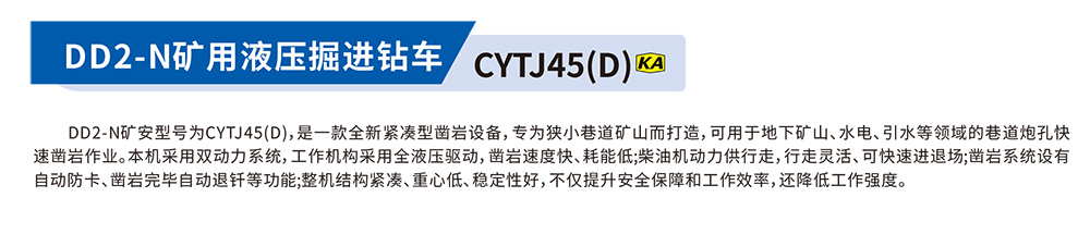 DD2-N礦安型號為CYTJ45(D),是一款全新緊湊型鑿巖設(shè)備,專為狹小巷道礦山而打造,可用于地下礦山,水電、引水等領(lǐng)域的巷道炮孔快速鑿巖作業(yè)。本機(jī)采用雙動力系統(tǒng),工作機(jī)構(gòu)采用全波壓驅(qū)動,鑿巖速度快、耗能低:柴油機(jī)動力供行走,行走靈活、可快速進(jìn)退場;鑿巖系統(tǒng)設(shè)有自動防卡、鑿巖完畢自動退釬等功能;整機(jī)結(jié)構(gòu)緊湊、重心低、穩(wěn)定性好,不僅提升安全保障和工作效率,還降低工作強(qiáng)度。