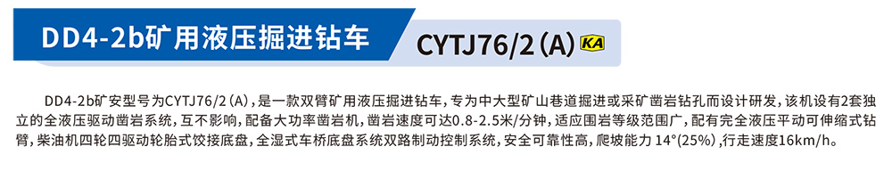 DD4-2b礦安型號為CYTJ76/2(A),是一款雙臂礦用液壓掘進(jìn)鉆車,專為中大型礦山巷道掘進(jìn)或采礦鑿巖鉆孔而設(shè)計(jì)研發(fā),該機(jī)設(shè)有2套獨(dú)立的全液壓驅(qū)動鑿巖系統(tǒng),互不影響,配備大功率鑿巖機(jī),鑿巖速度可達(dá)0.8-2.5米/分鐘,適應(yīng)圍巖等級范圍廣,配有完全液壓平動可伸縮式鉆降,柴油機(jī)四輪四驅(qū)動輪胎式餃接底盤,全濕式車橋底盤系統(tǒng)雙路制動控制系統(tǒng),安全可靠性高,爬坡能力 14°(25%),行走速度16km/h。