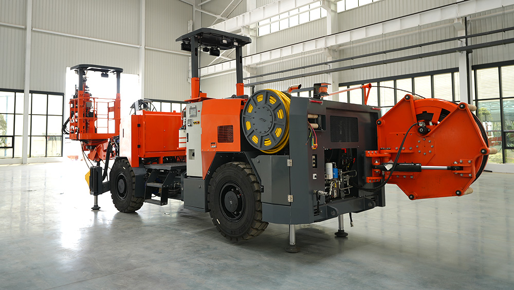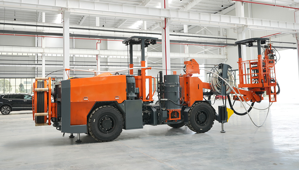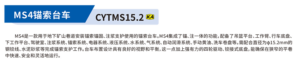 MS4是一款用于地下礦山巷道安裝錨索錨固、注漿支護(hù)使用的錨索臺車。MS4集成了錨、注一體的功能,配備了吊籃平臺、工作臂、行車底盤。下工作平臺、駕駛室、注漿系統(tǒng)、錨索系統(tǒng)、電器系統(tǒng)、液壓系統(tǒng)、水系統(tǒng)、氣系統(tǒng)、自動潤滑系統(tǒng)、手動黃油、洗車卷盤等。需配合直徑為φ15.2mm的鋼鉸線、水泥砂漿等完成錨索支護(hù)工作。臺車布置設(shè)計(jì)具有良好的視野和平衡,這一點(diǎn)加上強(qiáng)有力的四輪驅(qū)動、鉸接式底盤,能確保在狹窄的平巷中快速、安全和靈活地運(yùn)行。