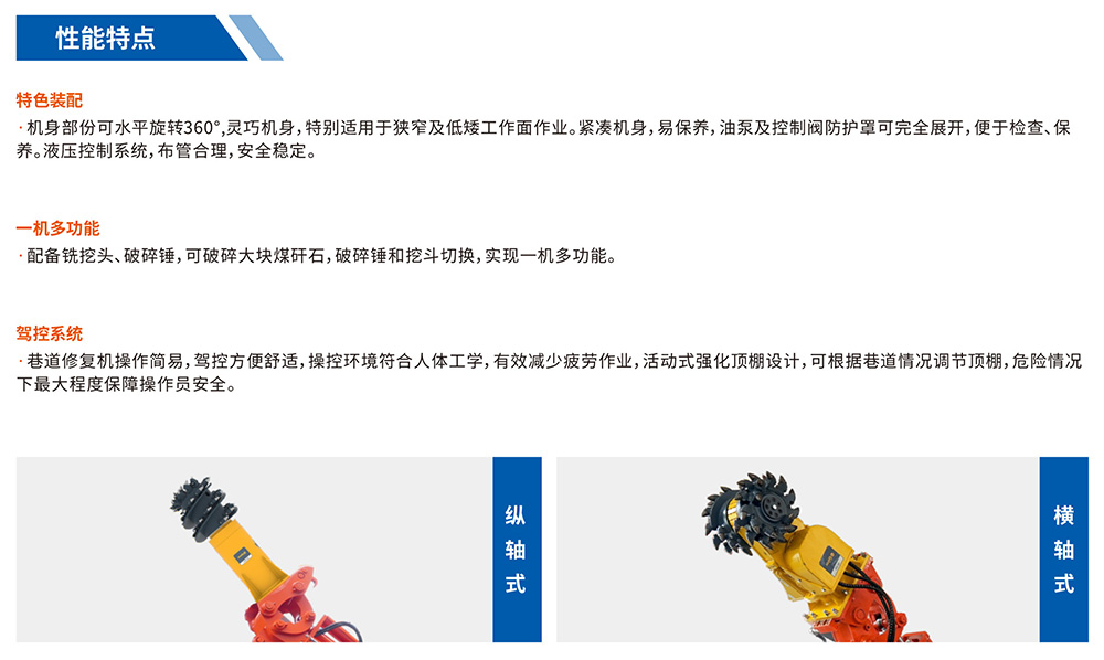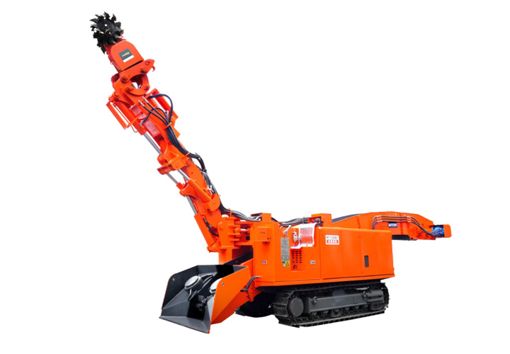 該設備是一款小型多功能機,截割功率高。該機結構緊湊、操作靈活、工作范圍大、可靠性高、便于分解下井和組裝,尤其是截割臂可以彎曲,屬國內獨創(chuàng),具有很強的耙料能力??筛鶕?jù)不同的工況條件,換裝巖石破碎鍾、鏟斗,進行巖石破碎、炮采耙料功能。既適合煤礦煤巷道的掘進,又可從事大型煤礦巷道修頂、刷幫和切底工作,特別是針對煤礦巷道?,F(xiàn)的底鼓現(xiàn)象,該機以其小巧靈活、工作范圍大、移動方便的特性,切底效率顯著,具有其它掘進機不可比擬的優(yōu)越性。